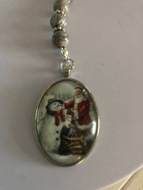 The perfect little gift for all book lovers big and small. This one is made with grey silk jasper and the glass domed pendant is a traditional Santa and snowman scene. Bookmark is silver embossed metal. This one hangs 14cm long,