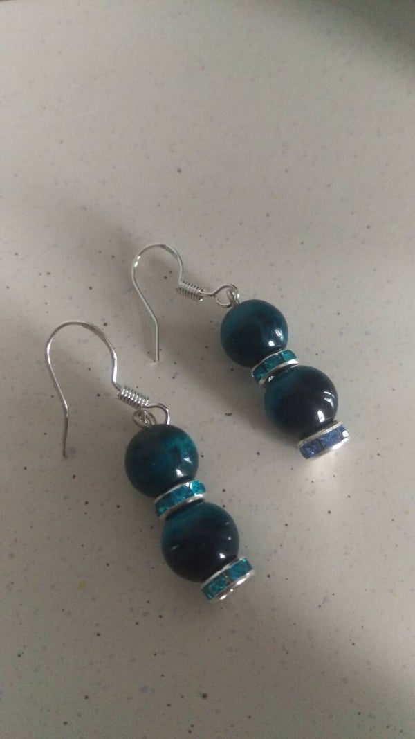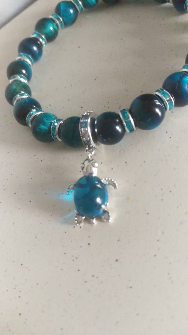 Blue tiger eye bracelet and matching earrings set. Mesmerising blue tiger eye 8mm beads, 6mm sparkly blue rhinestone rondelle spacer beads and completed with this adorable sterling silver blue murano glass sea turtle charm. Fits wrist size standard 17-19cm. Can be resized upon request. Please just contact me.