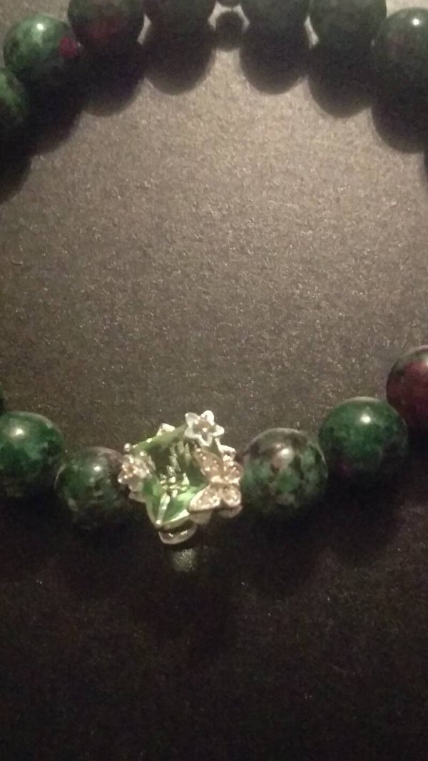 Beautiful 8mm Ruby zoisite beads, 4mm silver ball spacer beads and this spectacular square peridot stone charm with tiny flowers and butterfly which both have cubic zirconia stones. Fits standard wrist size 17-19cm. Made with strong jewellery elastic.