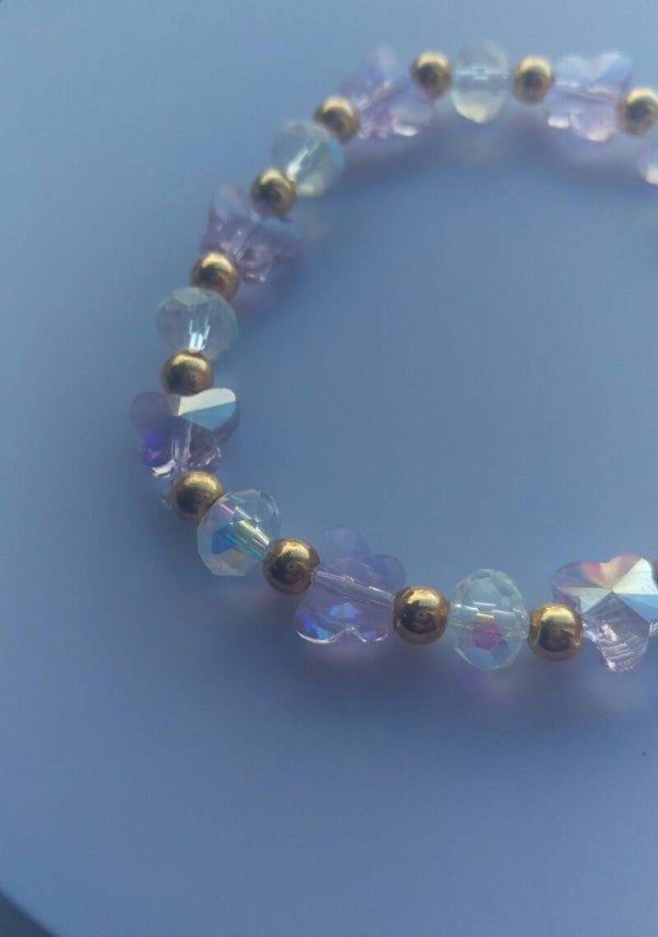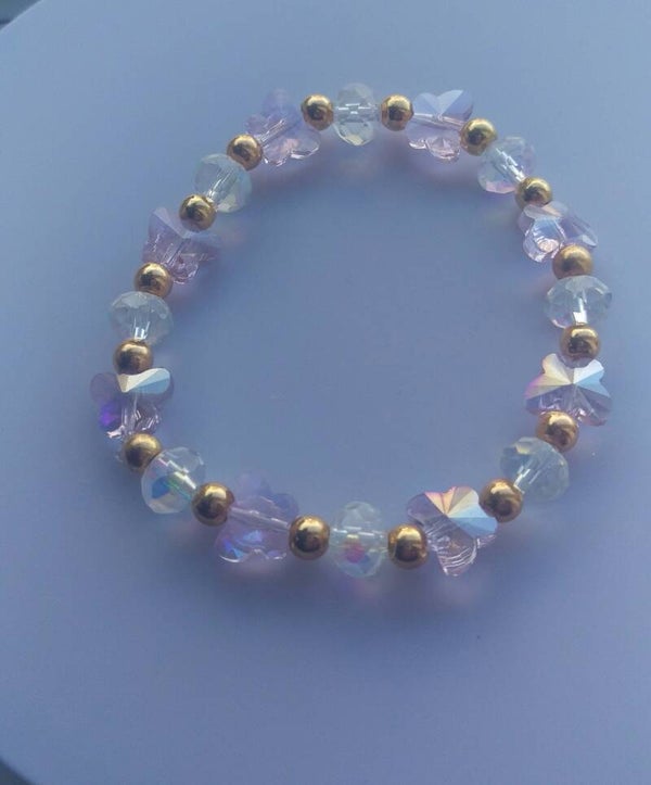 Lovely pretty little bracelet made with 10mm pink plastic faceted beads, 8mm round aurora borealis coloured beads and 4mm gold coloured ball beads.