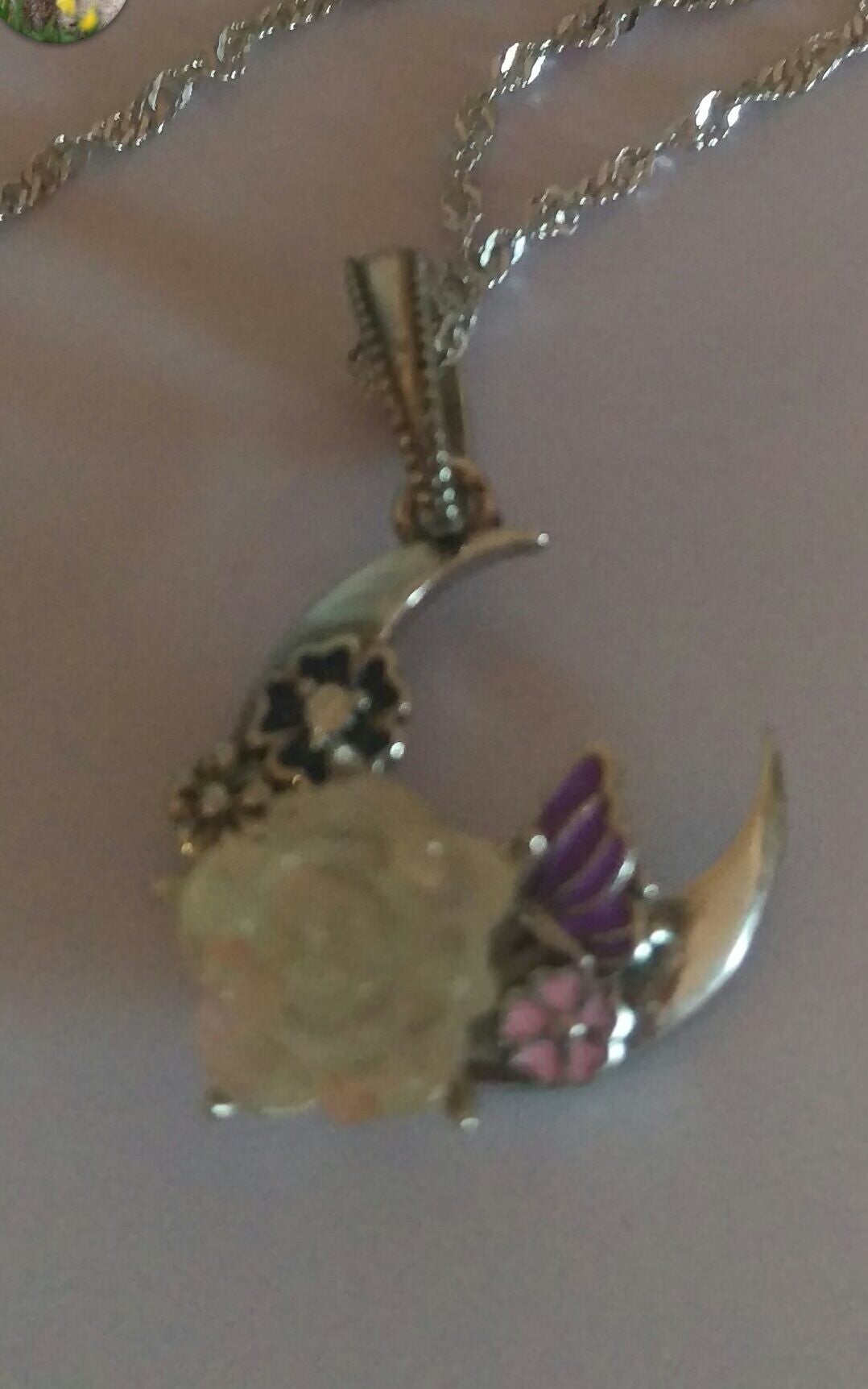 Beautiful 45cm water wave design sterling silver chain with antique silver glow in the dark rose moon charm with wee flowers, butterfly and colour changing resin rose. The rose will glow blue when in the dark.Spring ring clasp fastening.
