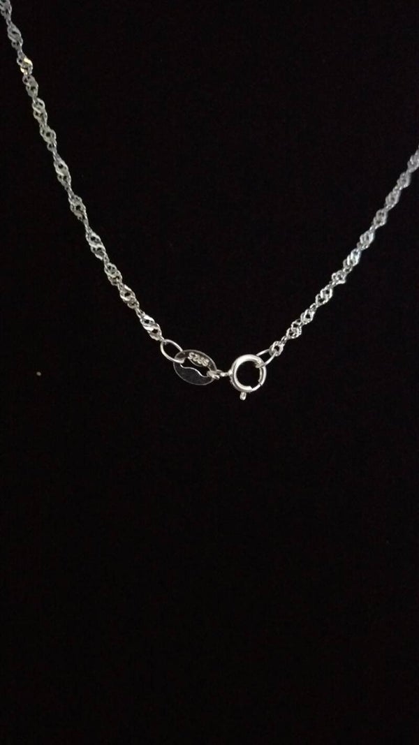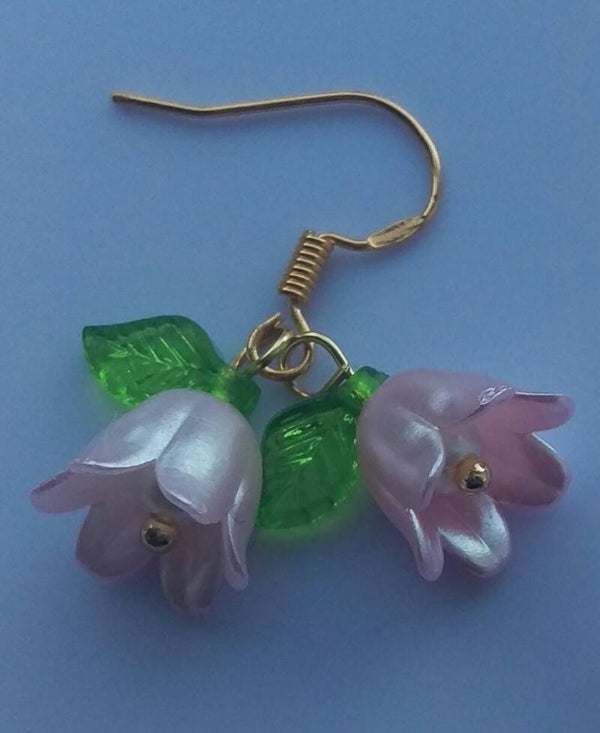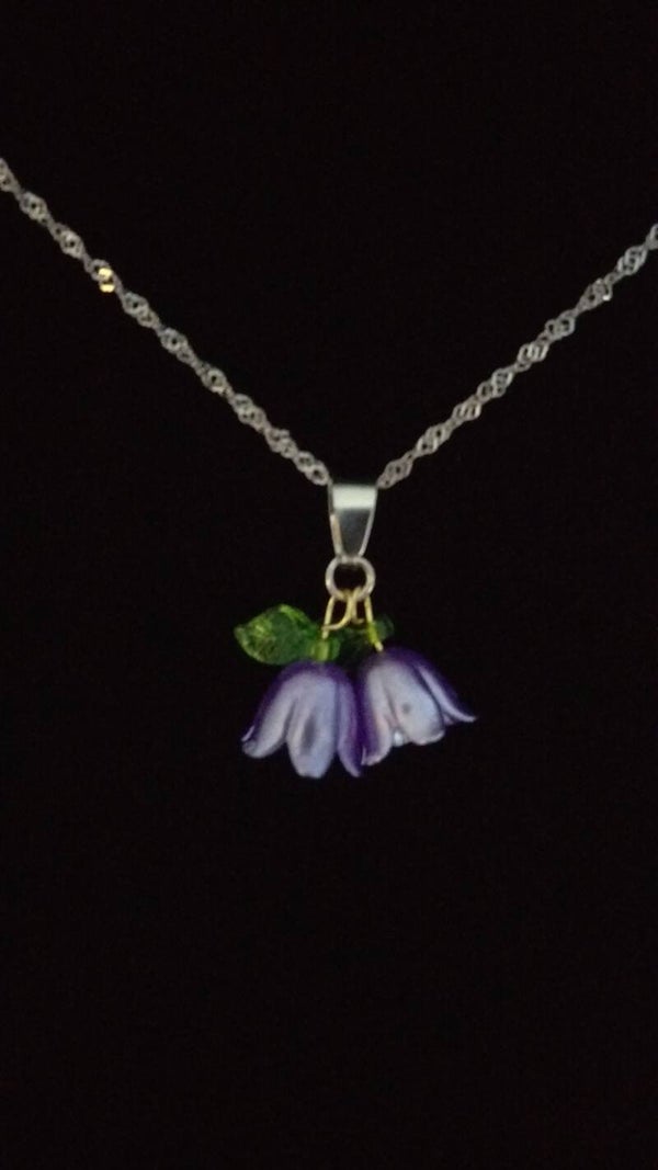 Pretty little acrylic bluebells with pearl centres (choice of pink or purple) These are attached with a silver pendant bail and sterling silver water wave chain 40cm with 5cm extender. Spring ring clasp fastening.