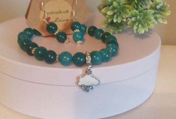 Blue Apatite jade 8mm bracelet with silver plated cloud charm with crystal droplets