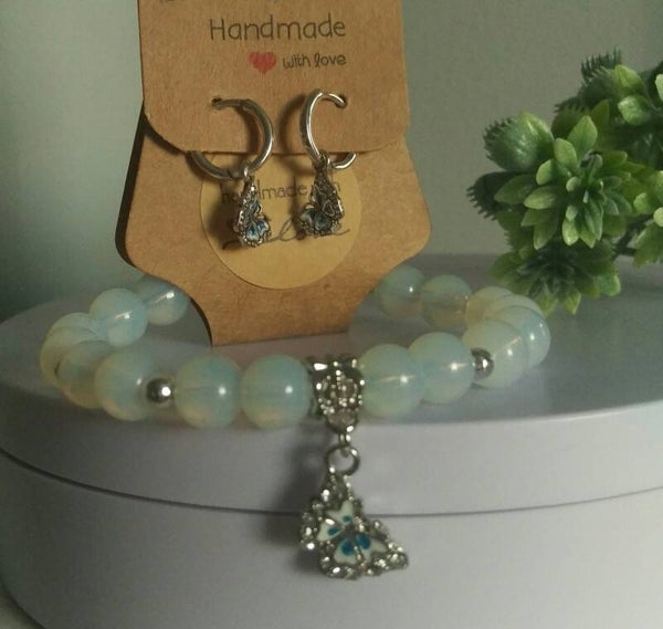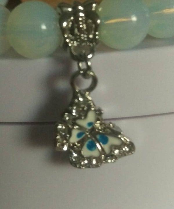 Stunning blue and white sterling silver butterfly charm which is paved with cubic zirconia around butterfly. 8mm opal beads are used as well as 4mm silver ball spacer beads. Made with strong jewellery elastic.