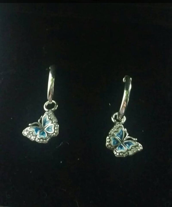 Earrings are sterling silver hoops with blue and white sterling silver butterfly charms. Hoops 12mm. Overall drop 22mm. Push in clip fastening.