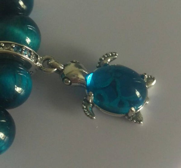 Blue tiger eye beaded bracelet with blue glass murano sterling silver turtle charm