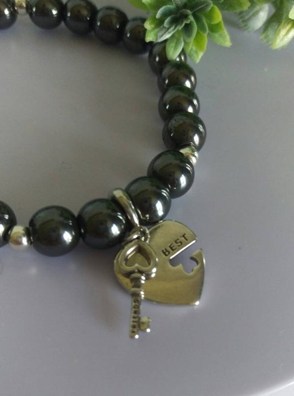Sterling silver heart charm with the word 'Best' engraved upon it and a separate sterling silver key charm with the words 'Friends' engraved upon it. Perfect gift for a special friend. 8my hematite beads and 4my silver spacer beads are used also to make this lovely stretchy bracelet.