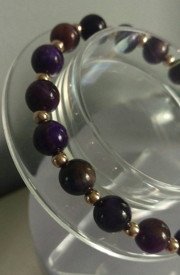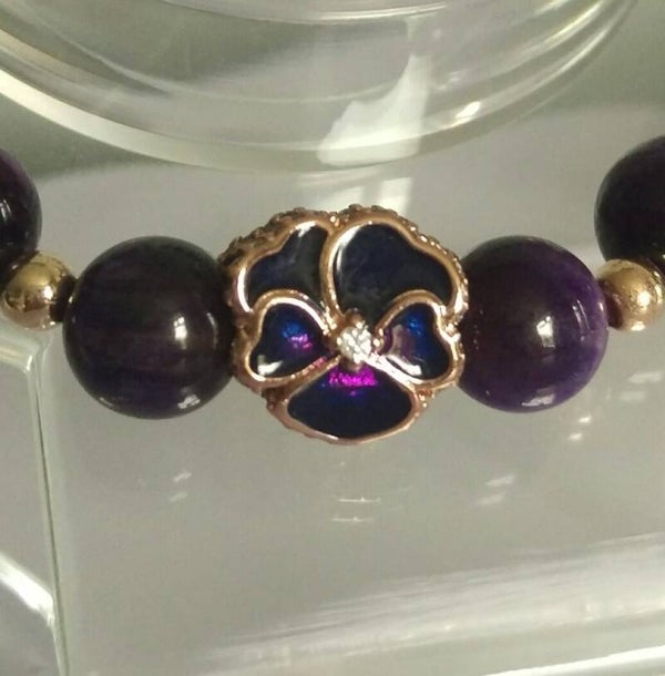 Beautiful 8mm purple tiger eye beads and 4mm rose gold ball spacer beads make this lovely beaded bracelet but what completes it is this stunning rose gold on sterling silver purple pansy charm with cubic zirconia stones.