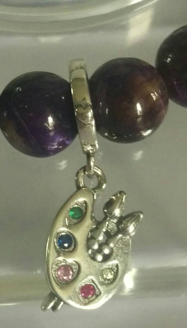 8mm purple tiger eye beads, 4mm hematite beads and this adorable sterling silver paint palette charm which features a green, blue, pink, red and white cubic zirconia stone for the paint and 2 paintbrushes.
