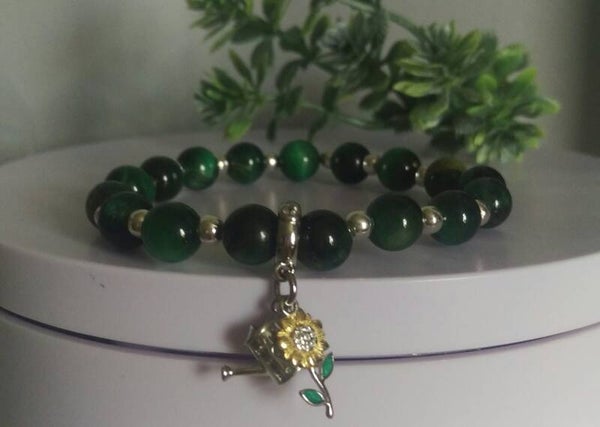 Perfect gift for the avid gardener. This sterling silver charm has a wee watering can with the words 'sunflower bloom' engraved upon it and a heart with clear stone, sunflower has been and yellow enamel with cubic zirconias in centre of flower. 8mm green tiger eye beads are used as well as 4mm silver ball spacers.
