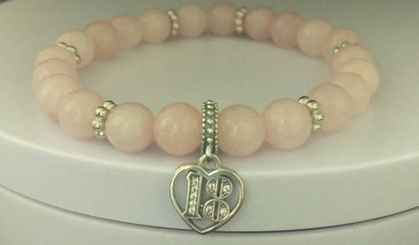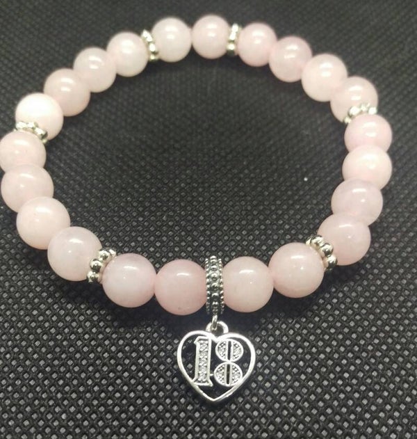 - Beautiful 18th gift. Pretty 8mm rose quartz beads, 6mm silver flower shaped spacers and completed with this stunning sterling silver 18th charm paved with cubic zirconia.
