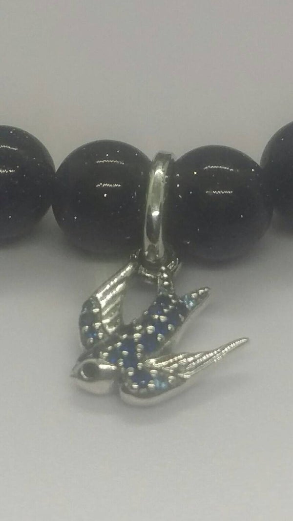 - Delightful beaded bracelet made with 8mm blue sandstone beads, mm silver spacer beads and completed with this stunning blue cubic zirconia stone sterling silver bird charm.
