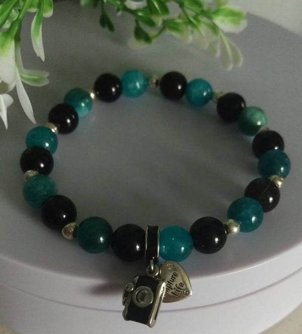 Pretty mixed beaded bracelet with blue apatite jade and black obsidian 8mm beads, 4mm silver ball spacer beads and completed with this charming sterling silver camera featuring a clear sparkly stone for the lens and a separate heart shaped disk with the words 'Capture life' engraved upon it.