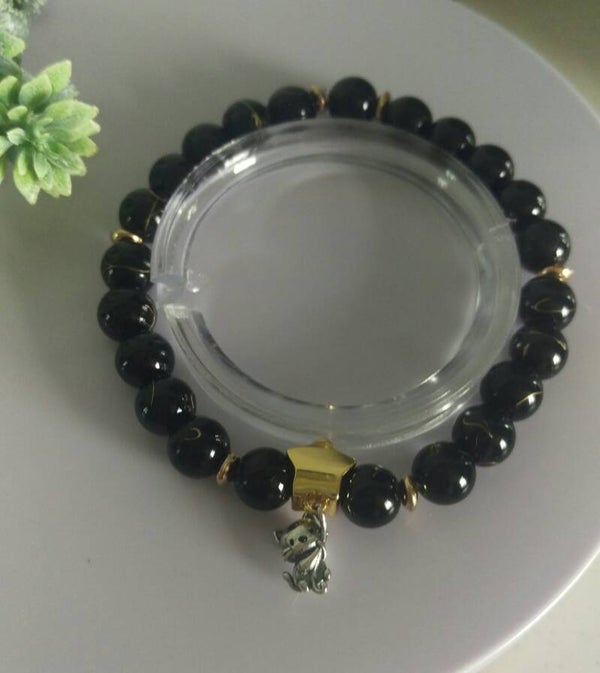 - Black golden wire agate 8mm beads, 4mm gold flat round spacer beads and finished off with this cute sterling silver charm featuring a wee cat dangling from a gold star. Perfect for any cat lover😻.