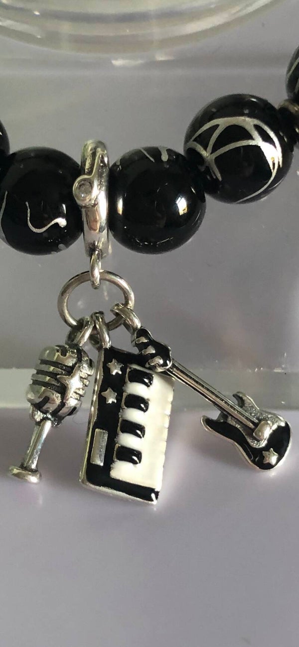 - Lovely little gift for the musician/music lover in your life. This bracelet has a sterling silver charm featuring 3 different charms, a keyboard, microphone & guitar and the charm bail has a musical note upon it featuring a cubic zirconia stone.
