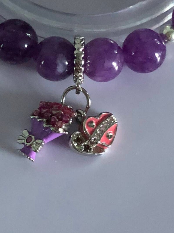 - Gorgeous amethyst is the base for this beauty and is completed with this most adorable sterling silver box of chocs charm and bouquet of flowers charms. The box of chocolates has cubic zirconia on lid and a few cubic zirconia in the box as chocolates. The purple bouquet has a mixture of pretty flowers in it. Make a beautiful gift for anyone