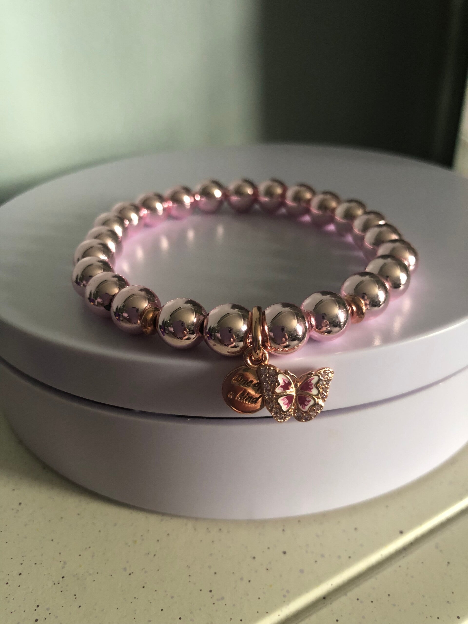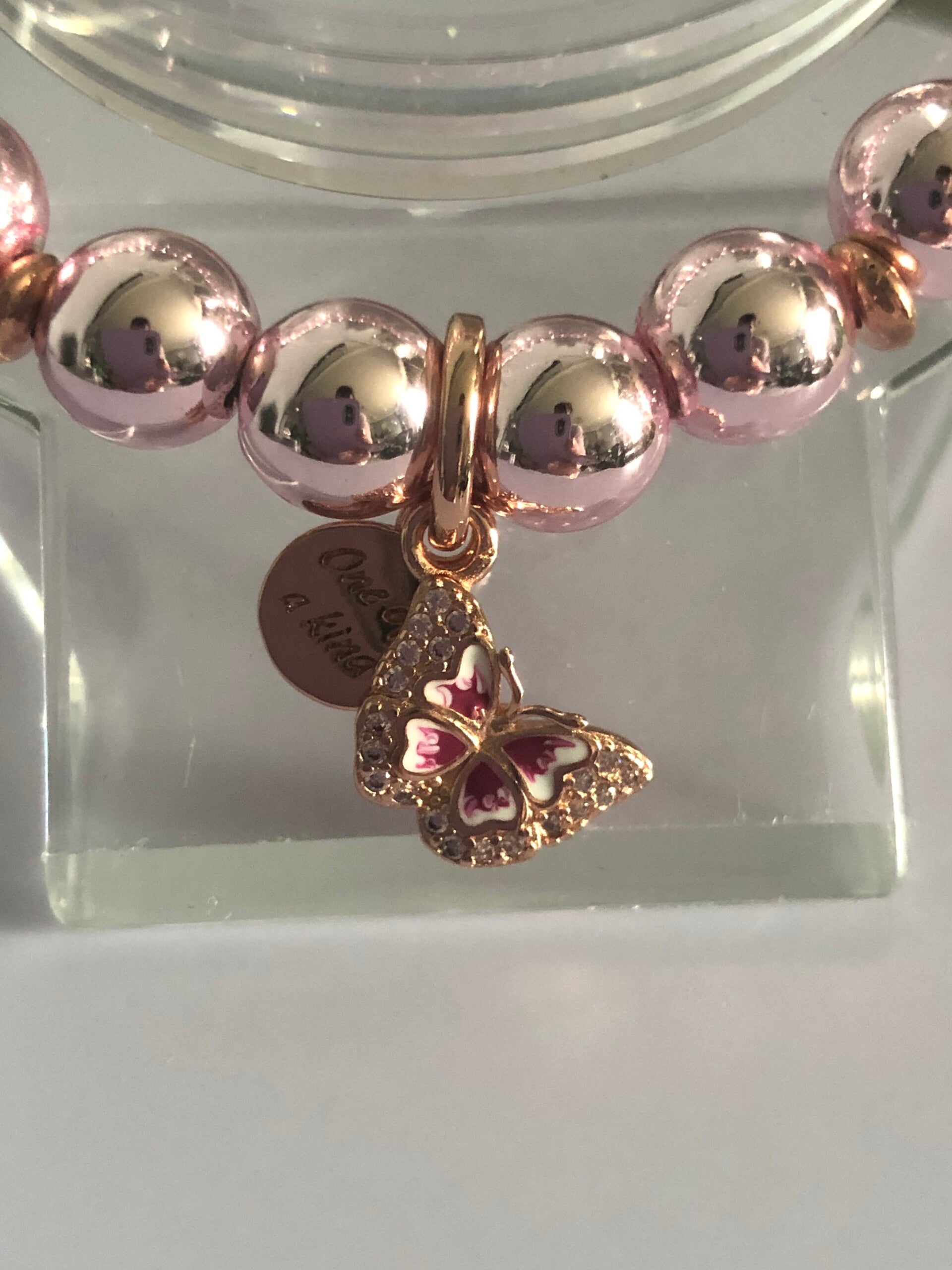 Stunning shimmery pink hematite handmade beaded bracelet using 8mm pink hematite beads, two 4mm rose gold coloured spacer beads and finished off with this stunning sterling silver charm. It's rose gold with a pink butterfly which is encrusted with cubic zirconia around wing edges and a second charm which is a rose gold round disc with the words 'One of a kind' engraved upon it.